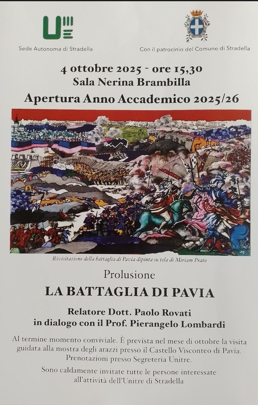 In occasione dell'apertura dell'anno Accademico 2025/2026, il 4 ottobre 2025 alle ore 15:30 c/o la Sala Nerina Brambilla di Stradella, si terrà la prolusione in cui il Dott. Paolo Rovati , in dialogo con il Prof. Pierangelo Lombardi tratteranno l'argomento della BATTAGLIA DI PAVIA